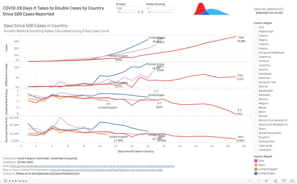 This morning as I was sipping on my homebrew coffee, and I was thinking about how to change a compound growth rate from a percentage into a human understandable metric. We need to apply the Rule of 70 for population growth, if you simply take 0.70 and divide by the growth rate percentage by day you can get the number of days it will take cases to double. With the power of Tableau and Snowflake you can slice by Country and State with mere clicks of the mouse to get growth rates relative to your situation. I am not a medical expert, but I wanted to just make this all more digestible and impactful to the people I love, work with, connect with, interact with and those in my local, state and global community.