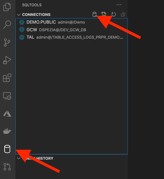 Now that we have this work of beauty, how do we use it? Click on the database barrel on the left column. Add a connection to your Snowflake account you want to query. Do this by clicking the add connection database barrel with a + sign.