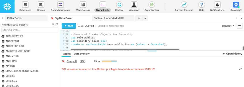 Working as desired with the “SQL compilation error: Database ‘SNOWFLAKE’ does not exist or not authorized.” error. Notice the UI also has far fewer tables as well further indicating the lesser privileges for this assumed role of Public.
